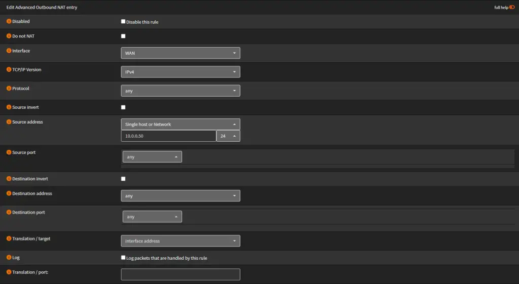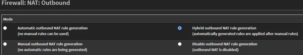 Head over to Firewall → NAT → Outbound. Select Hybrid Outbound NAT Rule and then save